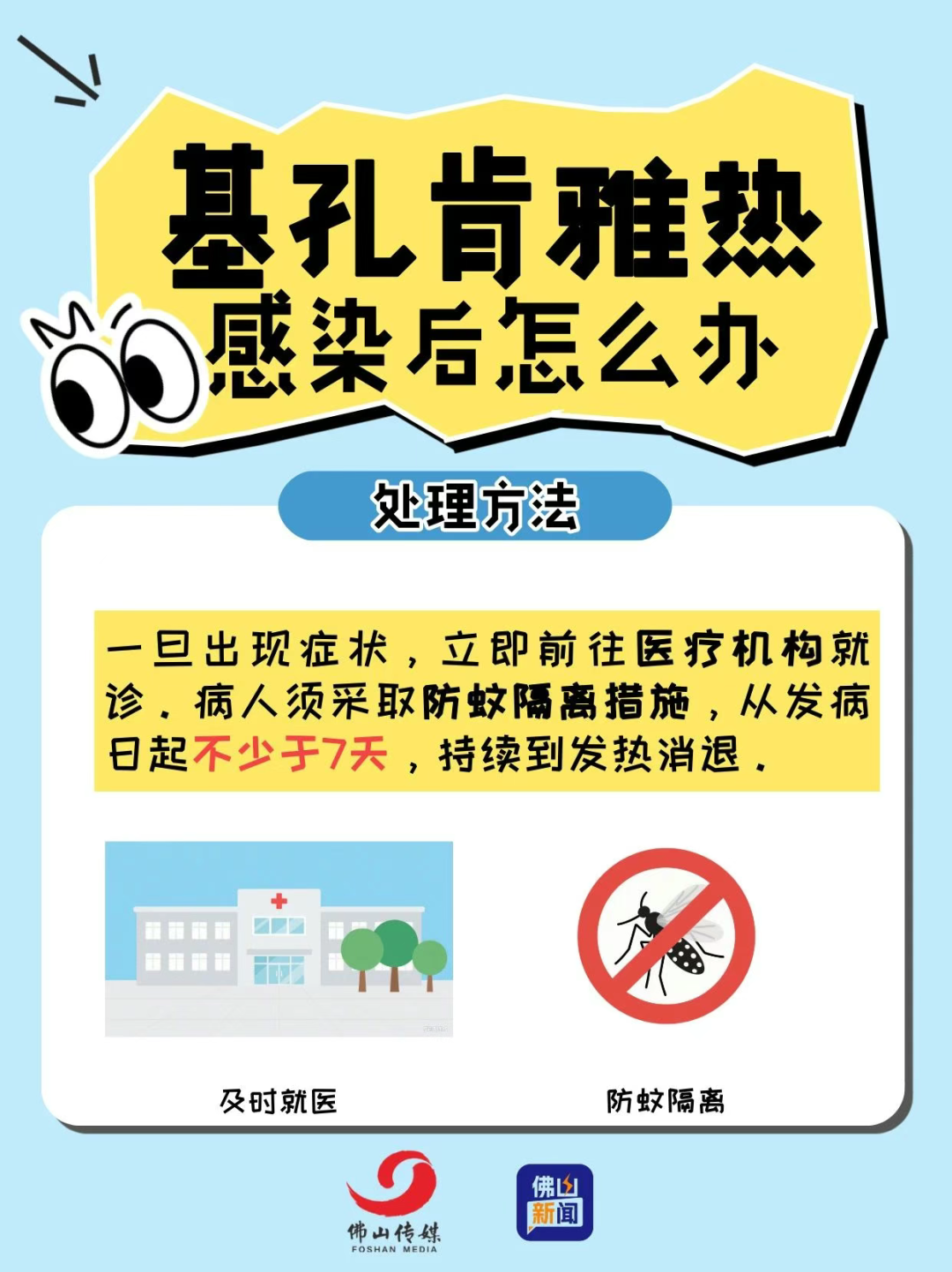 一旦出现发热、关节痛、皮疹等症状,请立即前往医疗机构就诊,以便早发现、早诊断、早治疗。病人须采取防蚊隔离措施,防蚊隔离期限从发病日起不少于7天,且应持续到发热症状消退。