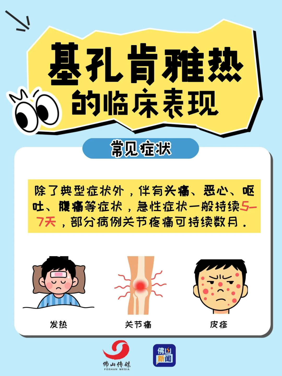 发热、关节痛、皮疹是本病的典型临床表现,可伴有头痛、恶心、呕吐、腹痛等症状,急性症状一般持续5-7天,部分病例关节疼痛可持续数月。