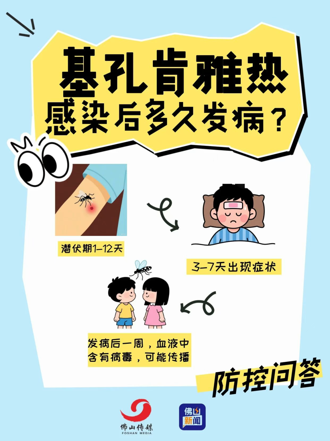 人感染后,潜伏期1-12天,通常3-7天出现症状。发病后一周内患者血液中含有病毒,这时可能通过伊蚊叮咬传播给他人。